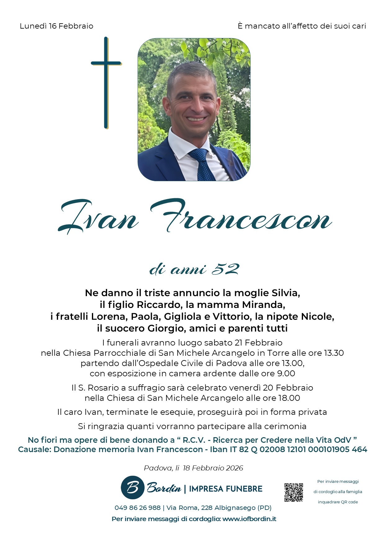 I familiari di Ivan ringraziano quanti vorranno onorare la sua memoria con un’opera di bene, sostenendo R.C.V. – Ricerca per Credere nella Vita OdV.